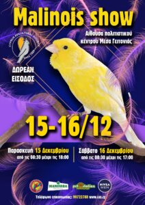 We invite you to visit our Malinois canary singing competition on the 15th and 16th of December which will take place at Mesa Geitonia cultural centre.